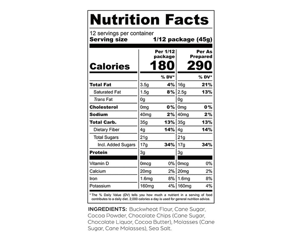 Buckwheat Flour, Cane Sugar, Cocoa Powder, Chocolate Chips (Cane Sugar, Chocolate Liquor, Cocoa Butter), Molasses (Cane Sugar, Cane Molasses), Sea Salt