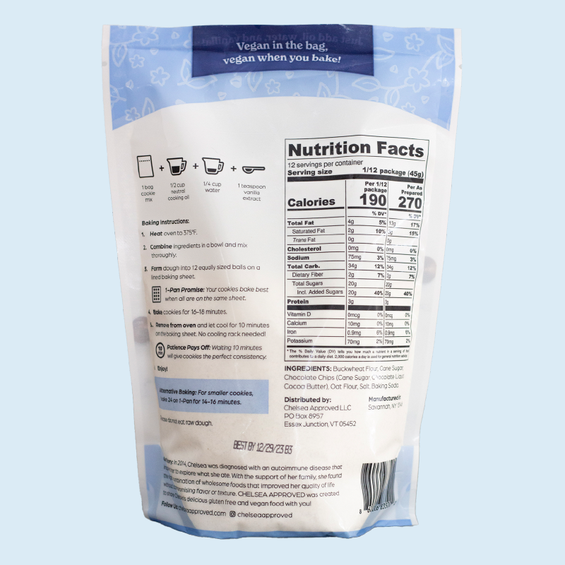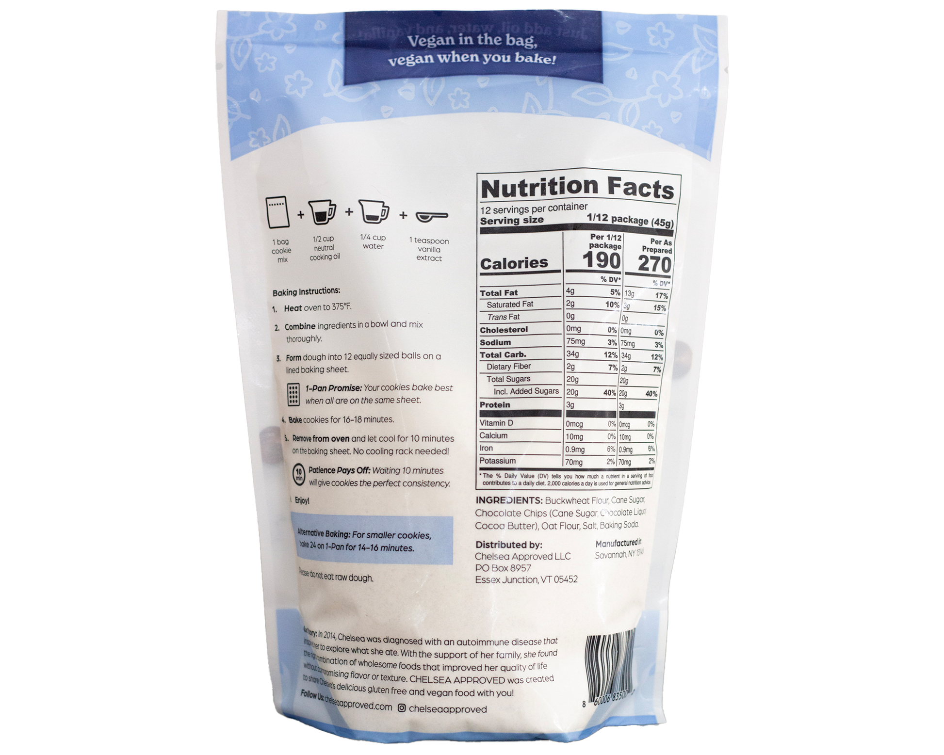 Classic chocolate chip cookies straight from your oven! Our chocolate chip cookie mixes are not only vegan and gluten free, but are easy to make right out of the bag, contain simple ingredients, and are irresistibly delicious. The best part about this chocolate chip cookie mix is that you can easily make 12 large cookies, 24 mini cookies, or even a large skillet cookie!