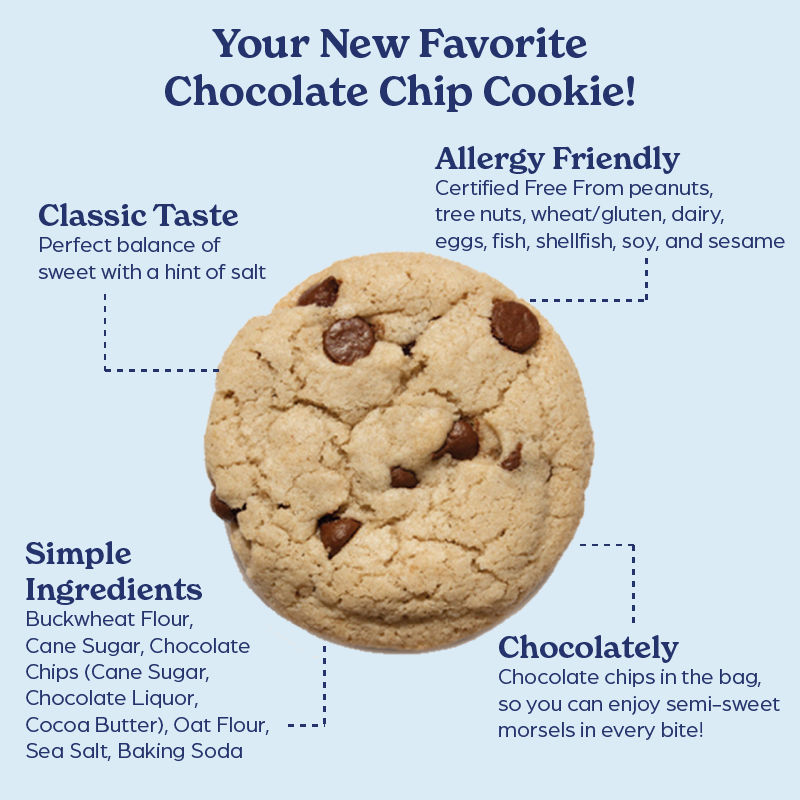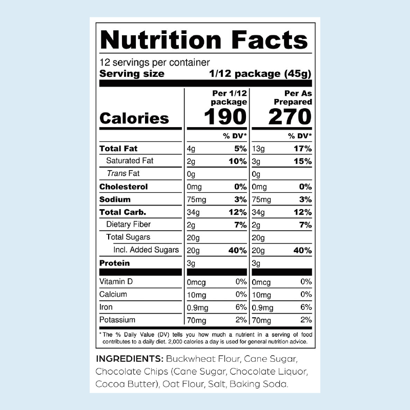 Buckwheat Flour, Cane Sugar, Chocolate Chips (Cane Sugar, Chocolate Liquor, Cocoa Butter), Oat Flour, Salt, Baking Soda