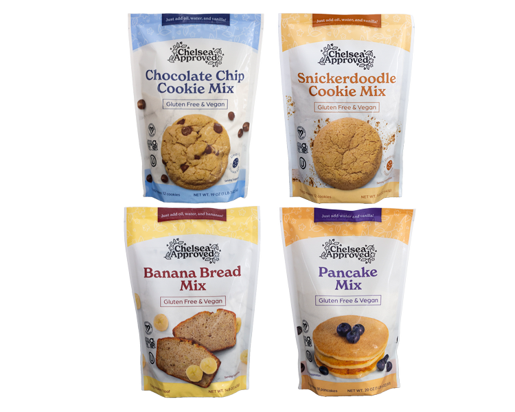 Try all of the Chelsea Approved Vegan & Gluten Free Baking Mixes in our multi-pack bundle! Our multi-pack contains 4 flavors including Chocolate Chip Cookie Mix, Pancake & Waffle Mix, Banana Bread Mix, and Snickerdoodle Cookie Mix. Whether you’re in the mood for a Sunday morning pancake breakfast or a Monday night batch of cookies, we’ve got you covered! You’ll fall in love with all these baking mixes, and will enjoy sharing them with friends and family!